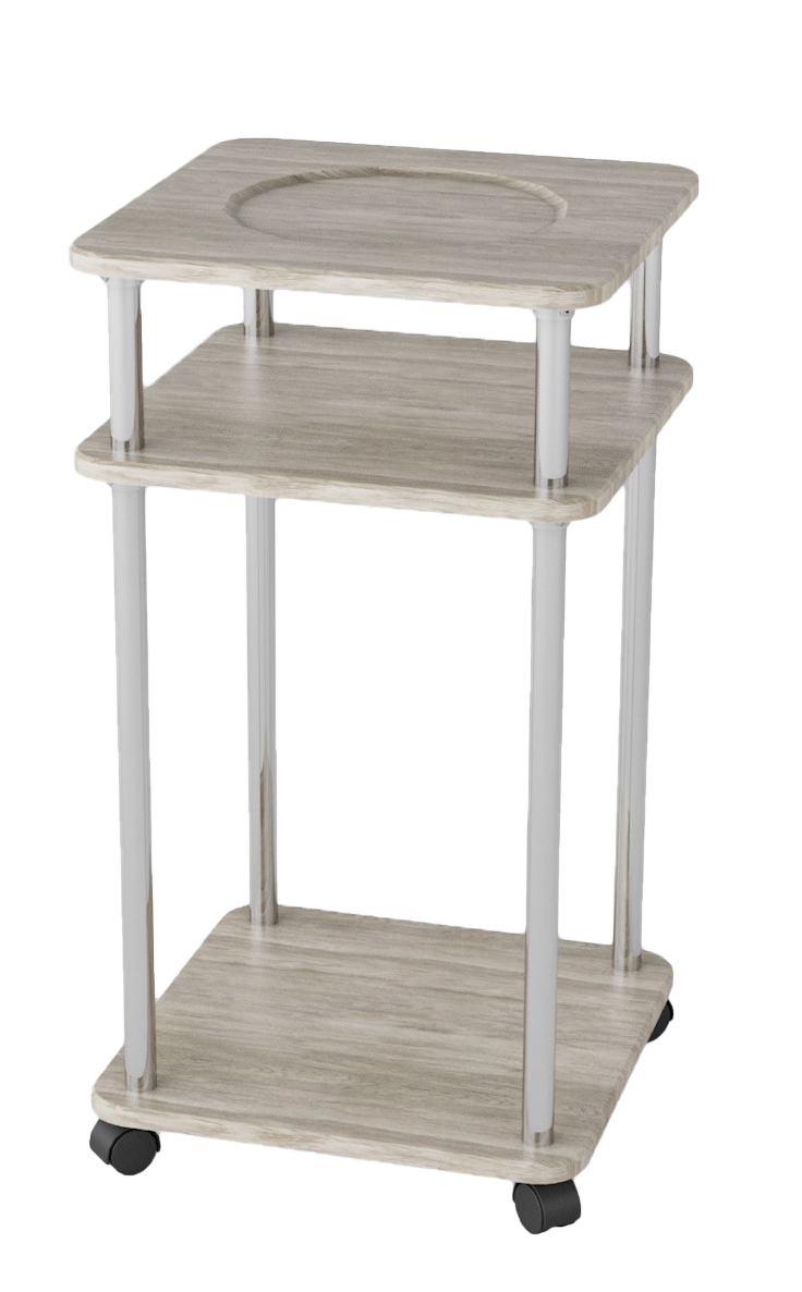Подставка для кулера изготовлена из МДФ толщиной 16 мм, а опоры выполнены из хромированной трубы. Она обладает мобильностью благодаря колесным опорам и оснащена регулируемой по высоте полкой. Эта модель позволяет экономить пространство, так как предназначена для установки кулера с одной бутылью и дополнительной запасной.