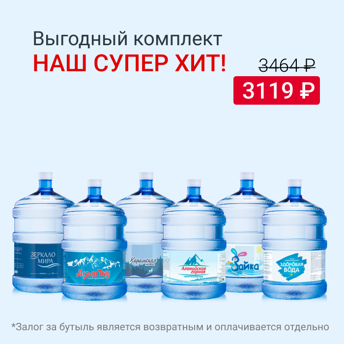 При единовременном заказе 6 разных вод в бутылях по 19л ваша выгода составит 20%!