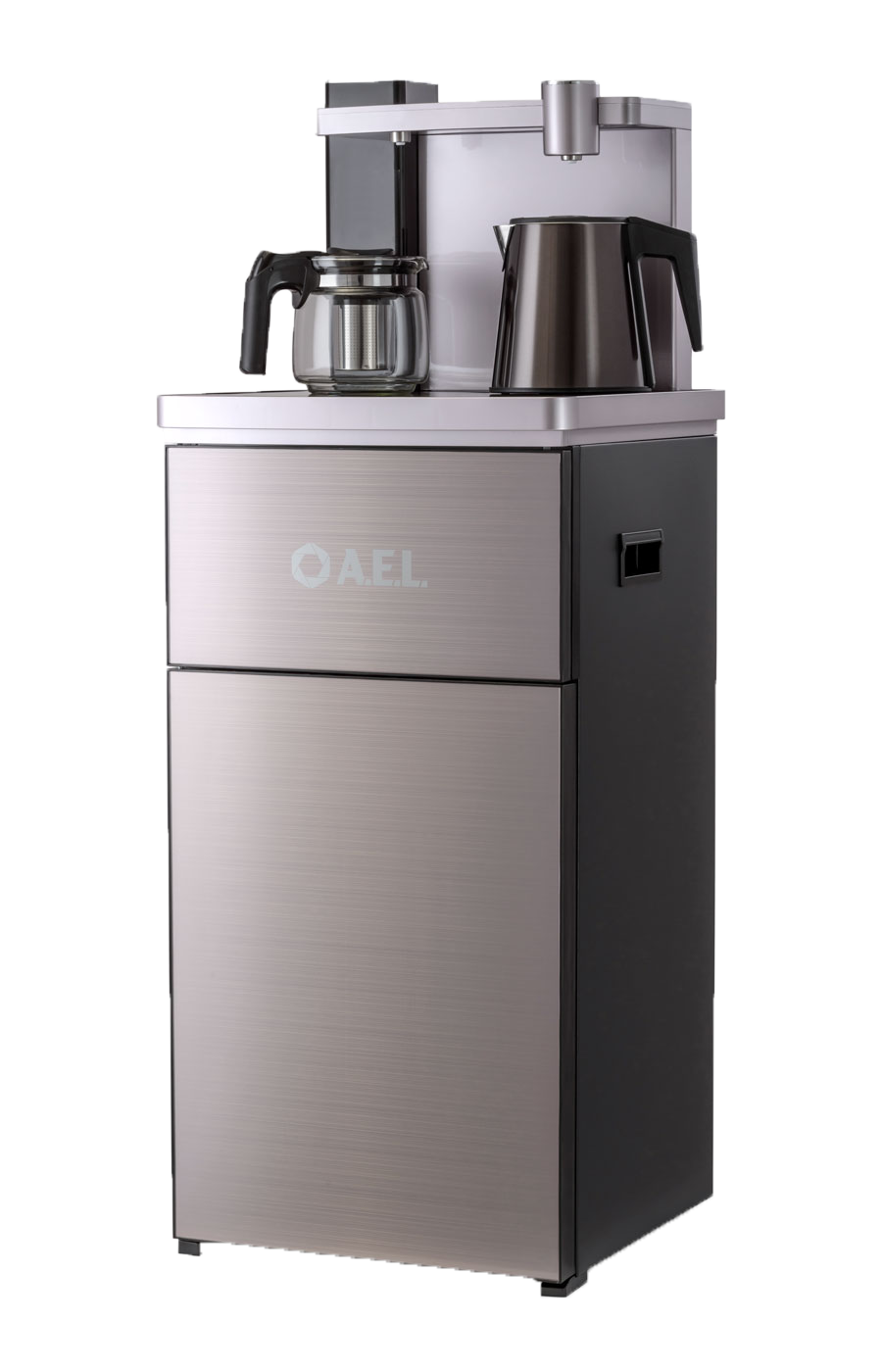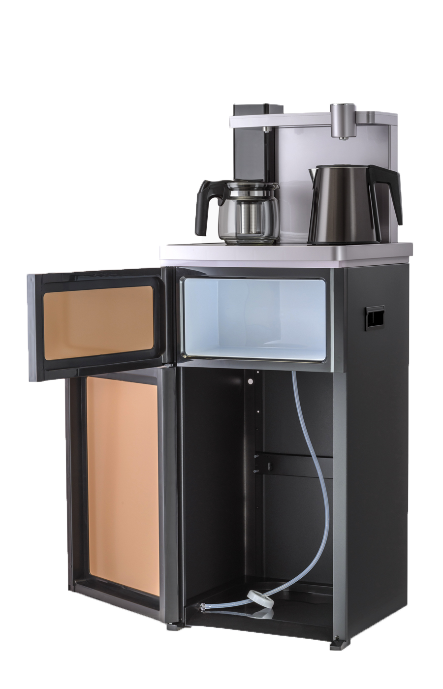 Оригинальное исполнение кулера с нижней загрузкой бутыли без охлаждения. Состоит из заварочного и электрического чайников, сенсорной панели управления, полочки для чашек, шкафчика для хранения.